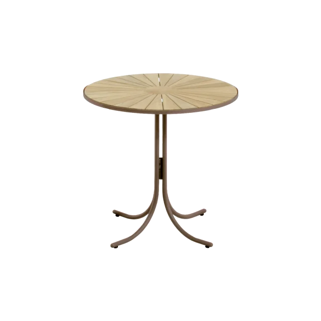 Cafébordet måler en diameter på 70 cm og har en højde på 68 cm - stadig nok til at havestolene kan gå ind under bordpladen. Bordpladen er i teak og stellet i pulverlakeret aluminium.
